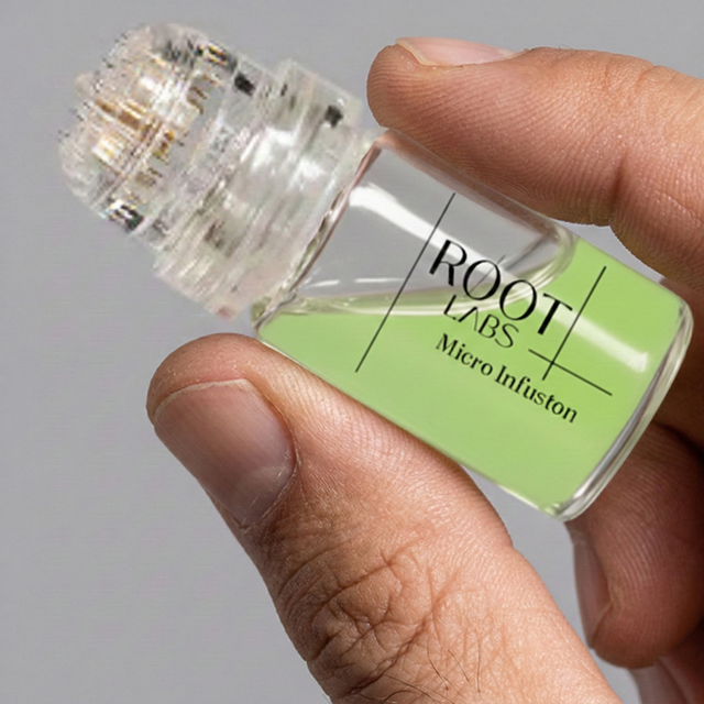 Het haargroeisysteem van RØOTLABS maakt gebruik van een dermatologisch geïnspireerde technologie:piepkleine, vergulde micronaalden openen op zachte wijze de bovenste huidlaag, zodat krachtige werkstoffen gericht bij de haarwortels kunnen komen.