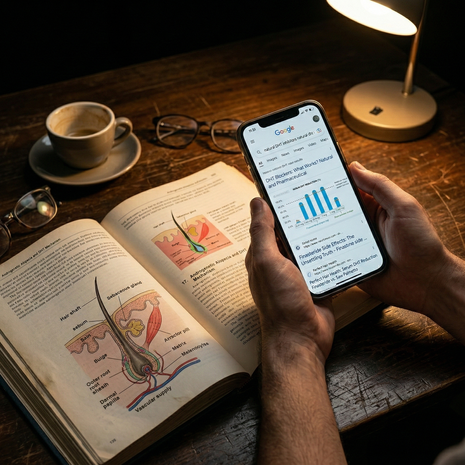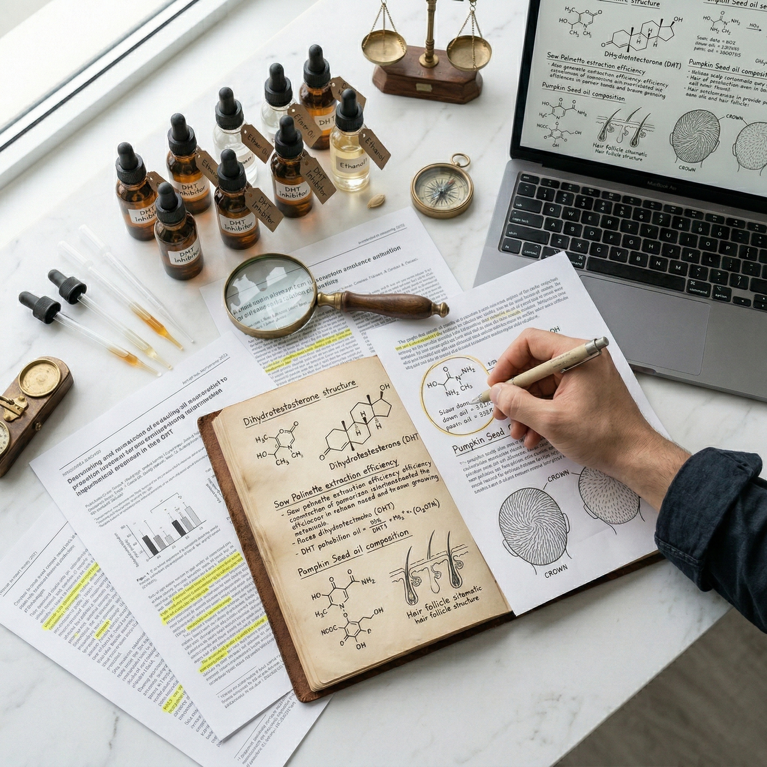Met mijn achtergrond in biochemie en cosmetische wetenschap dook ik in de literatuur. Niet de marketingfolders van merken, maar de echte wetenschap. Peer-reviewed studies. Klinische trials. Ik wilde weten: bestaat er een manier om DHT aan te pakken zonder de bijwerkingen van medicatie?